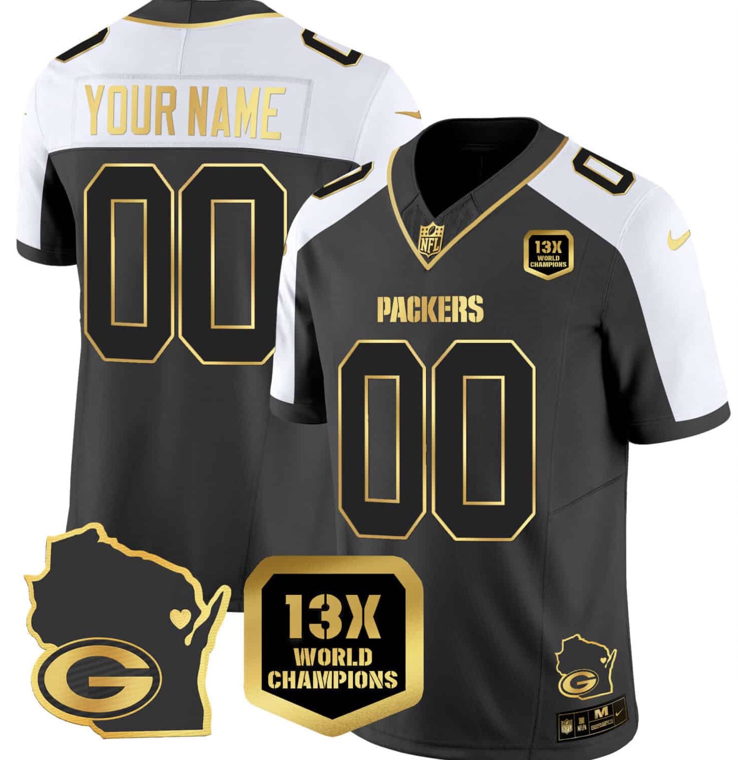 Packers 13 Time World Champions & Home Patch Gold Vapor Jersey V2 – All Stitched