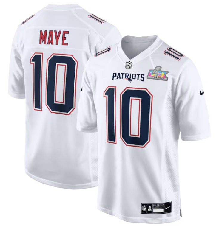 Men's New England Patriots #10 Drake Maye Nike White Super Bowl LX Patch Game Jersey