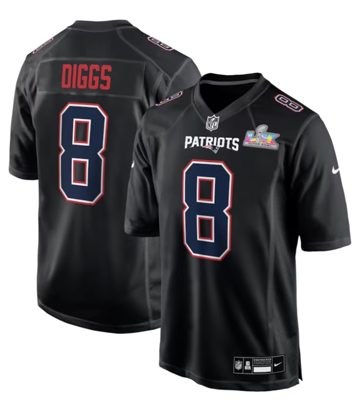 Men's New England Patriots #8 Stefon Diggs Nike Black Super Bowl LX Patch Carbon Fashion Game Jersey