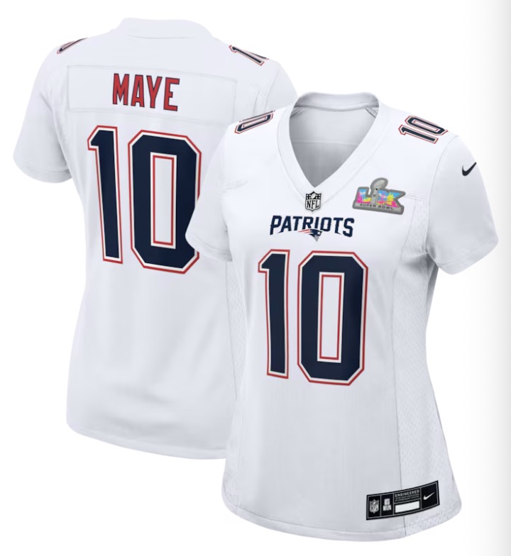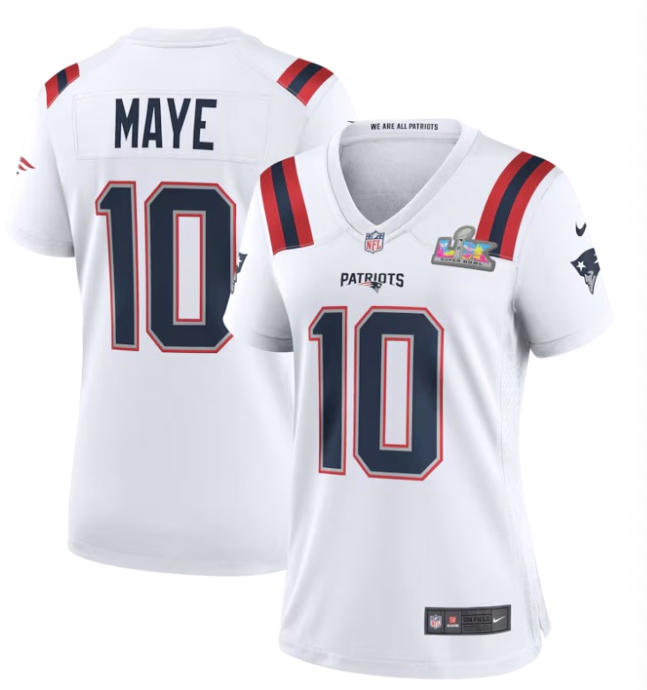 Women's New England Patriots #10 Drake Maye Nike White Super Bowl LX Patch Game Jersey