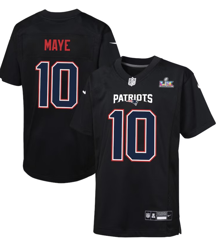 Youth New England Patriots Drake Maye Nike Black Super Bowl LX Patch Carbon Fashion Game Jersey