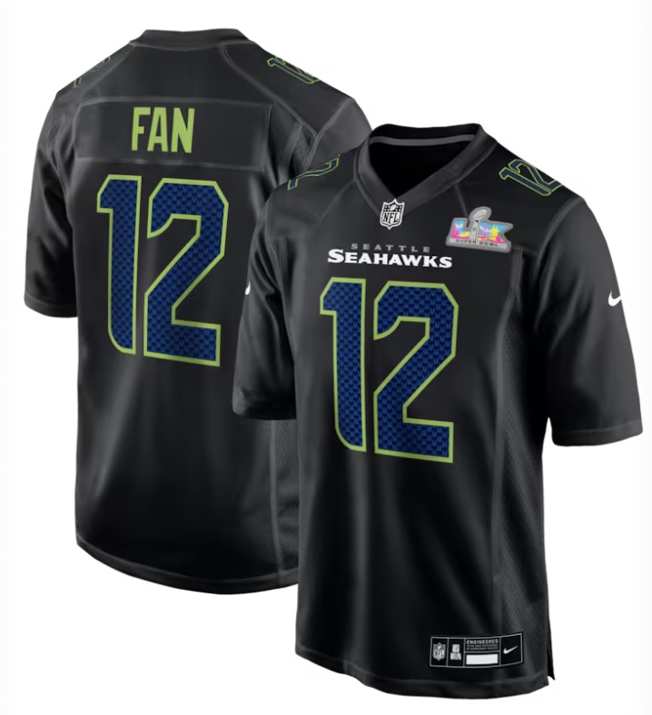 Men's Seattle Seahawks #12 12s Nike Black Super Bowl LX Patch Carbon Fashion Game Jersey