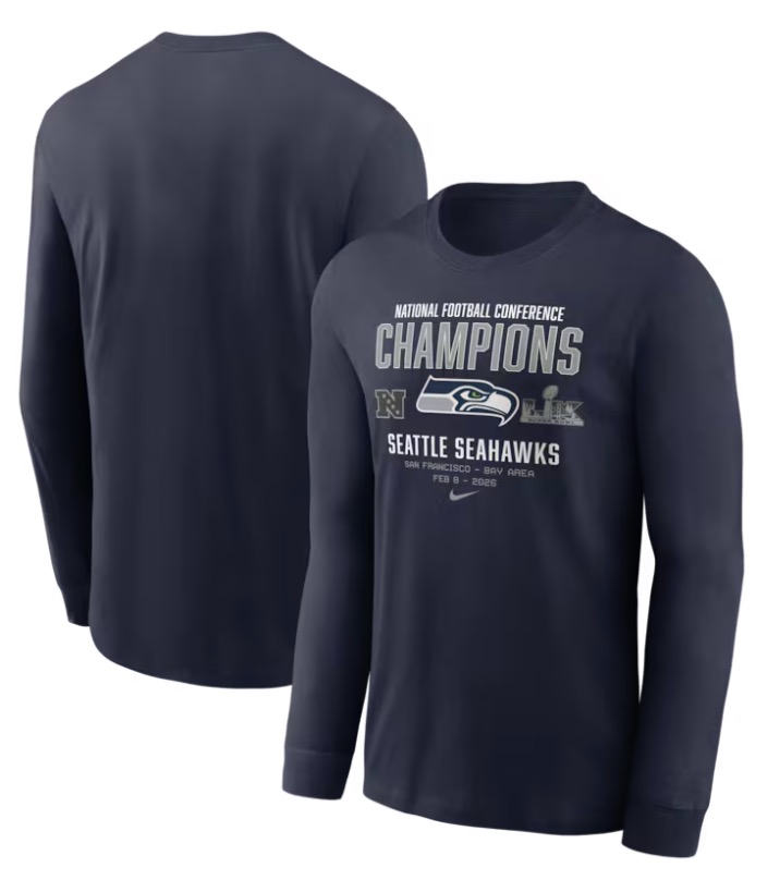 Men's Seattle Seahawks Nike College Navy 2025 NFC Champions Team Nation Long Sleeve T-Shirt
