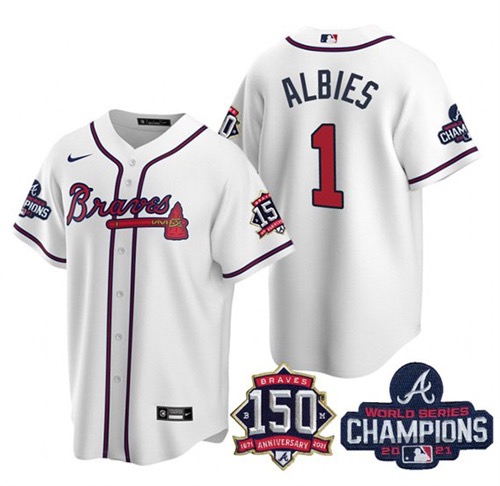 Men's Atlanta Braves #1 Ozzie Albies 2021 White World Series Champions With 150th