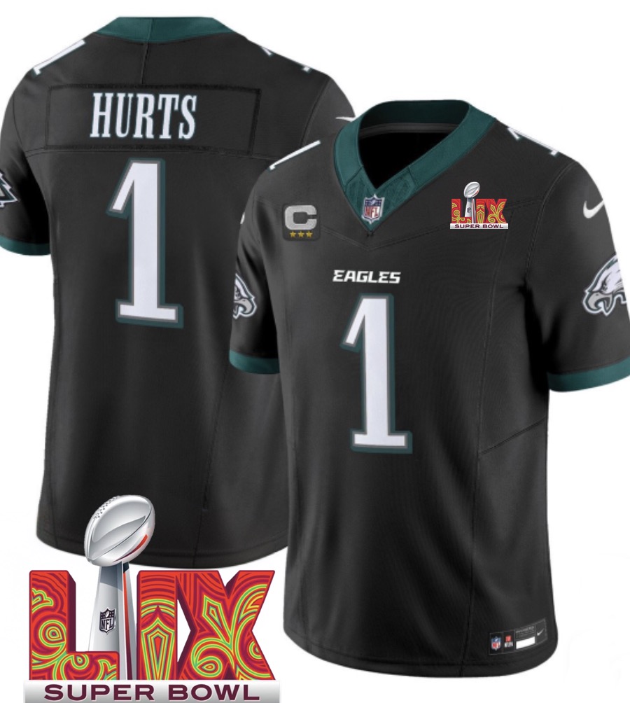 Men's Black Philadelphia Eagles #1 Jalen Hurts 2025 Super Bowl LIX Patch F.U.S.E. Vapor Limited Stitched Football Jersey