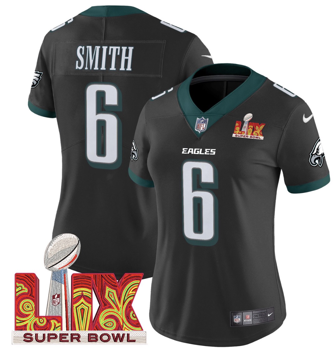 Women's Black Philadelphia Eagles #6 DeVonta Smith 2025 Super Bowl LIX Patch F.U.S.E. Vapor Limited Stitched Football Jersey