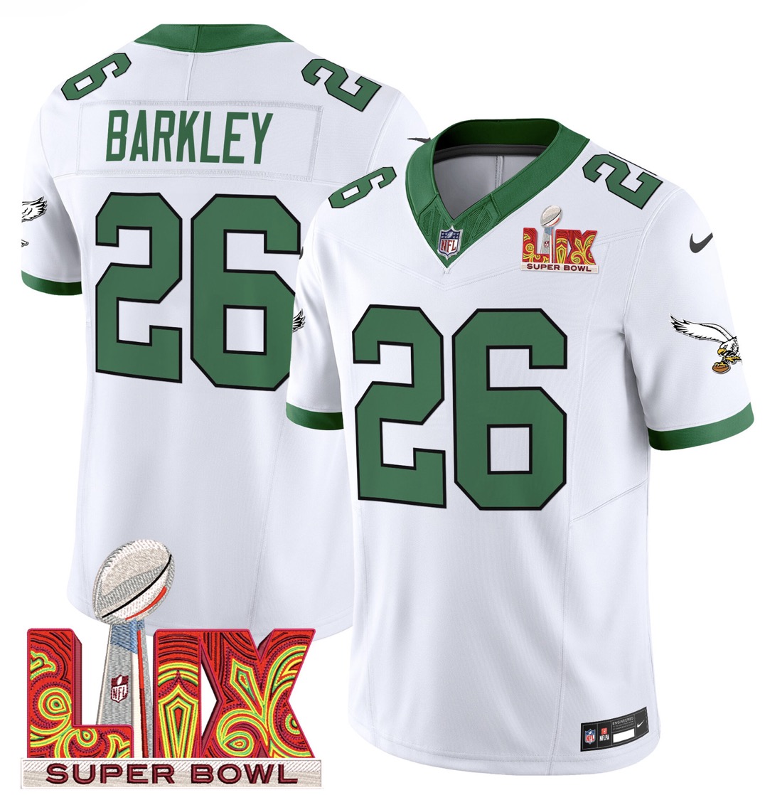 Youth White and Kelly Green Philadelphia Eagles #26 Saquon Barkley 2025 Super Bowl LIX Patch Jersey
